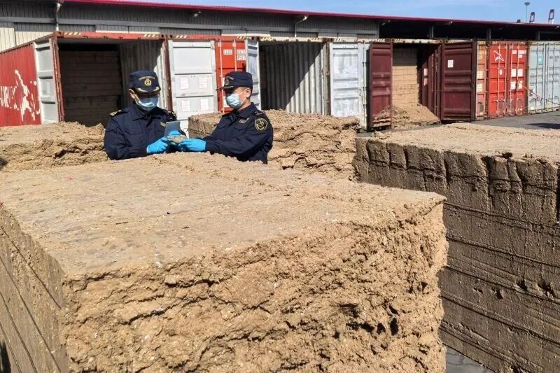 青岛海关查获以再生纸浆(块状)名义申报入境的“洋垃圾”。图片来自:青岛海关